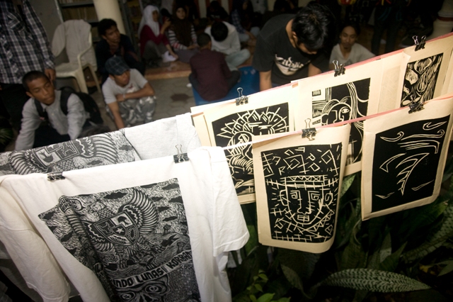 Sayangnya, plat MDF (multipleks yang mengandung serbuk kayu) yang dibagikan Ucup cuma dua puluh lembar. Peserta workshop yang tidak kebagian tetap menunggui kawan dan peserta lain menyelesaikan cukilan. Seraya menunggu selesai cukilan peserta, Ucup, Wibby, dan Yunan meminta peserta lain yang membawa kaos bila ingin disablonkan materi cukilan yang sudah mereka siapkan dari Yogyakarta.